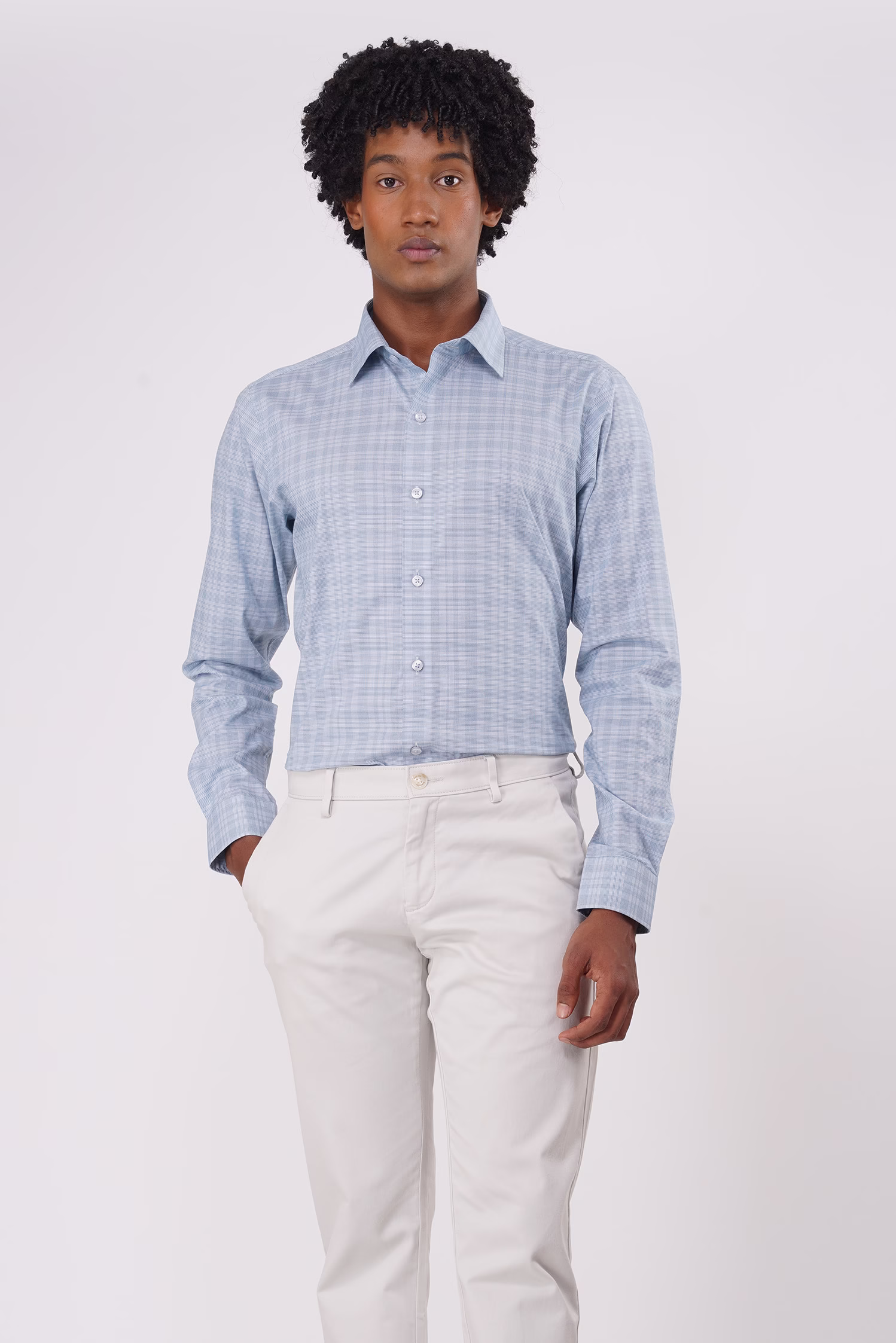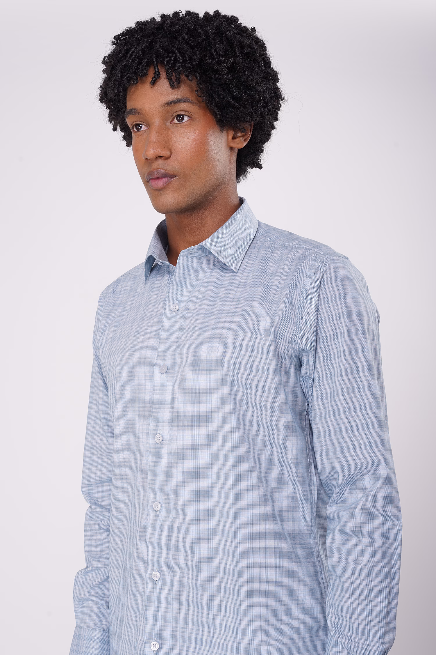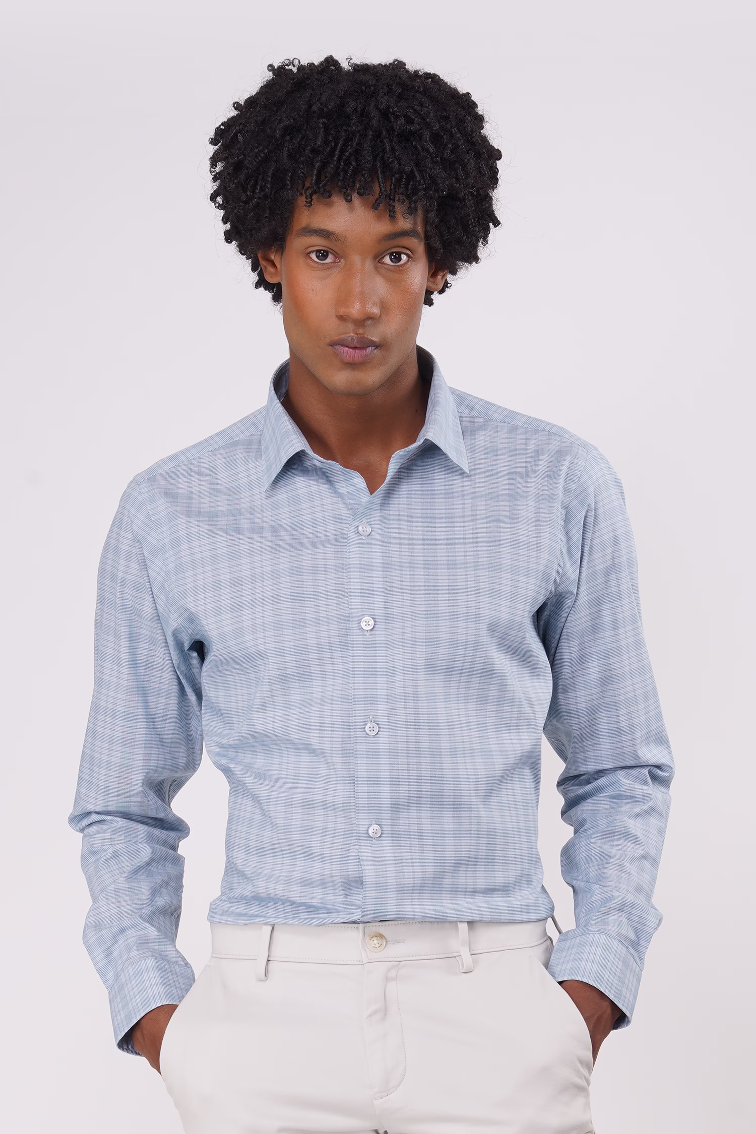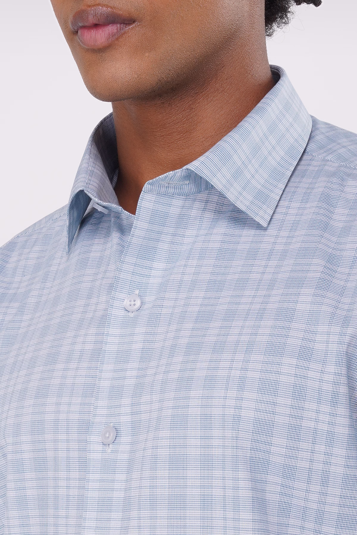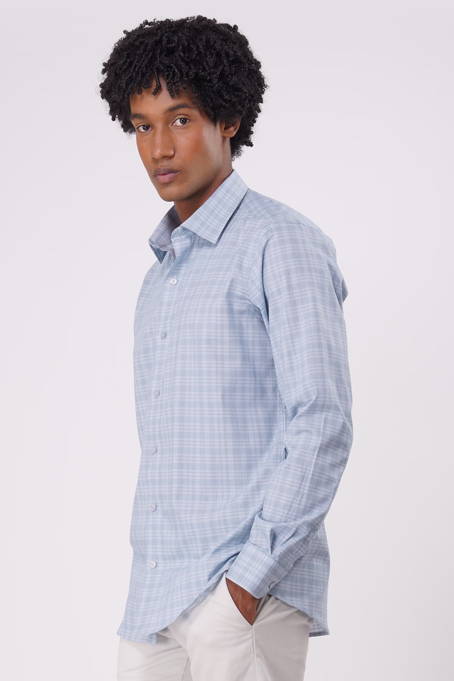 This classic light blue check shirt is crafted from fine cotton for effortless style. With a tailored fit and breathable fabric, it transitions seamlessly from office meetings to casual outings.