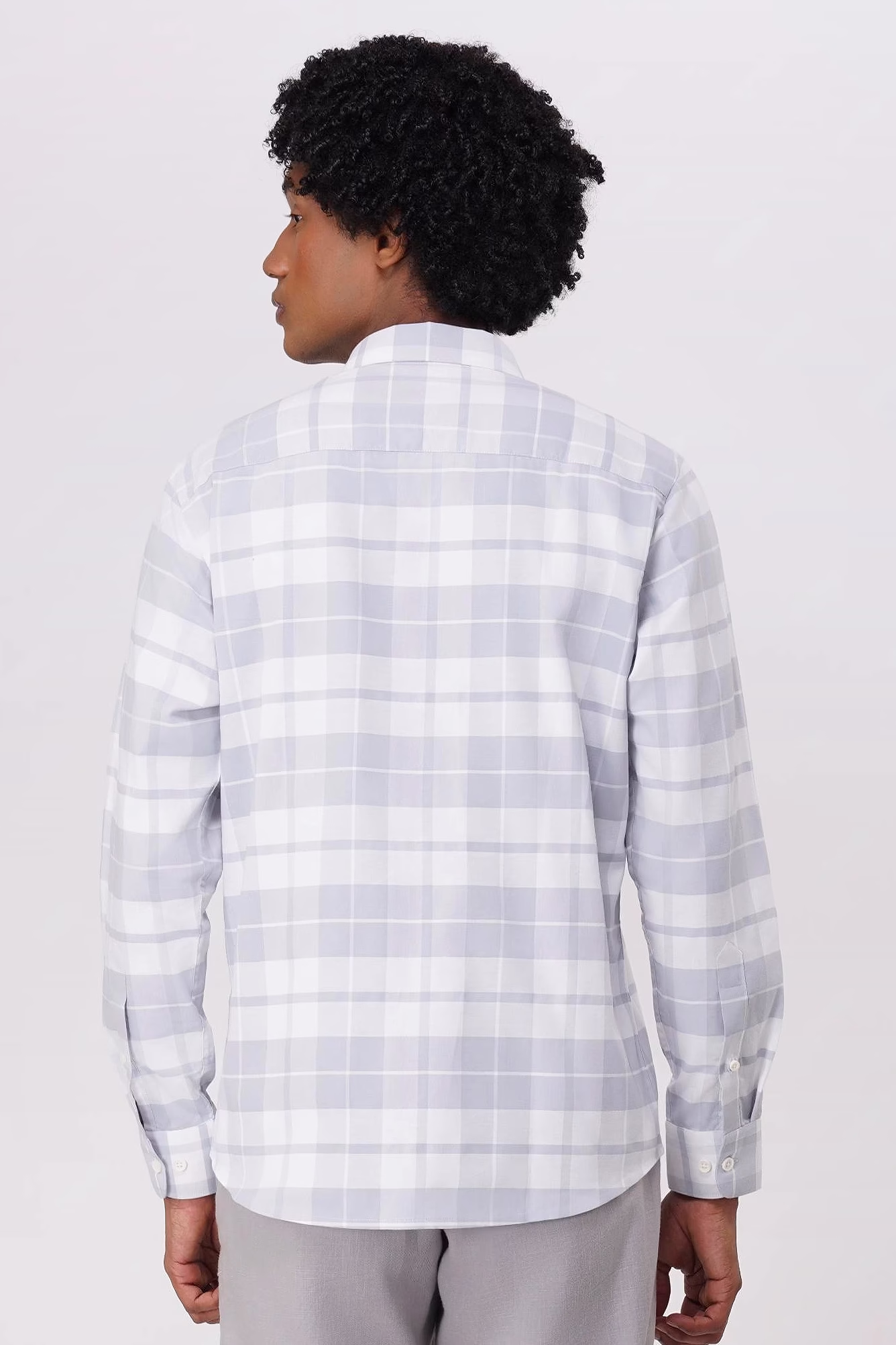 Powder blue and grey cotton check shirt, crafted for refined style and everyday elegance.