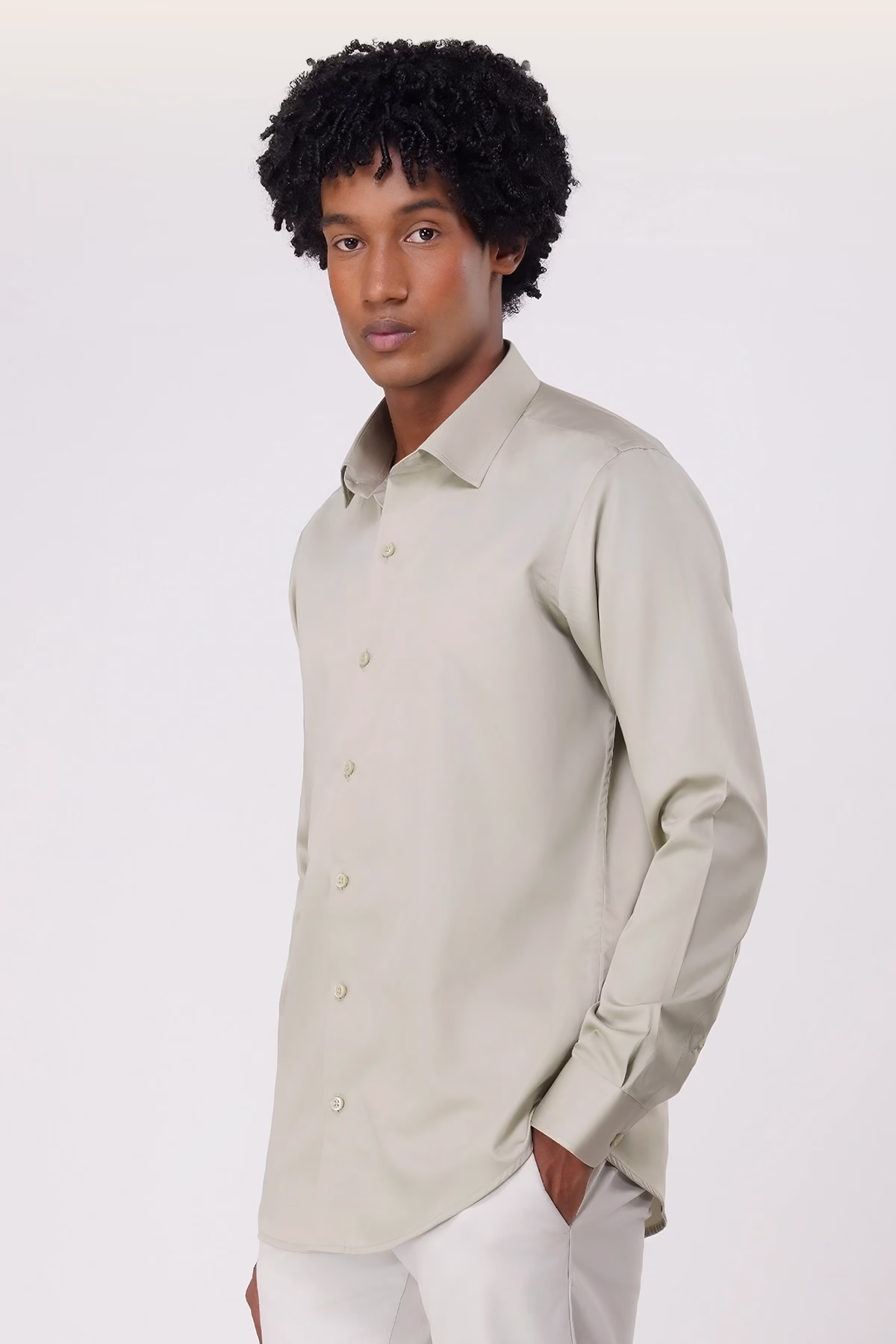 Sophisticated sage green satin weave shirt, crafted from luxury fabric for refined elegance.