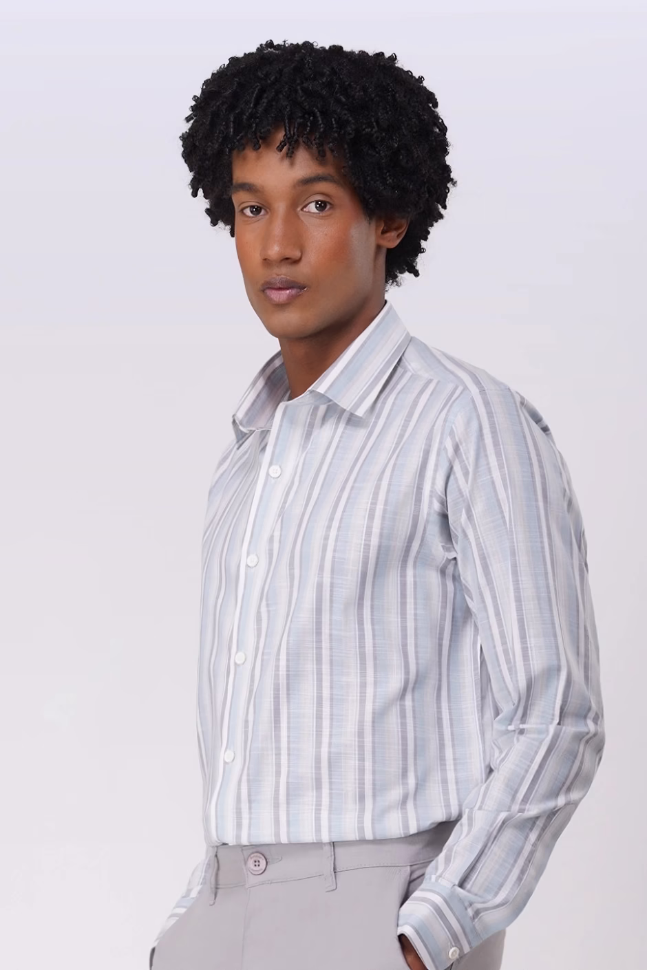 Made from premium cotton, this light blue striped shirt offers a perfect balance of comfort and elegance. Its classic pattern and tailored fit make it ideal for office and smart casual occasions.